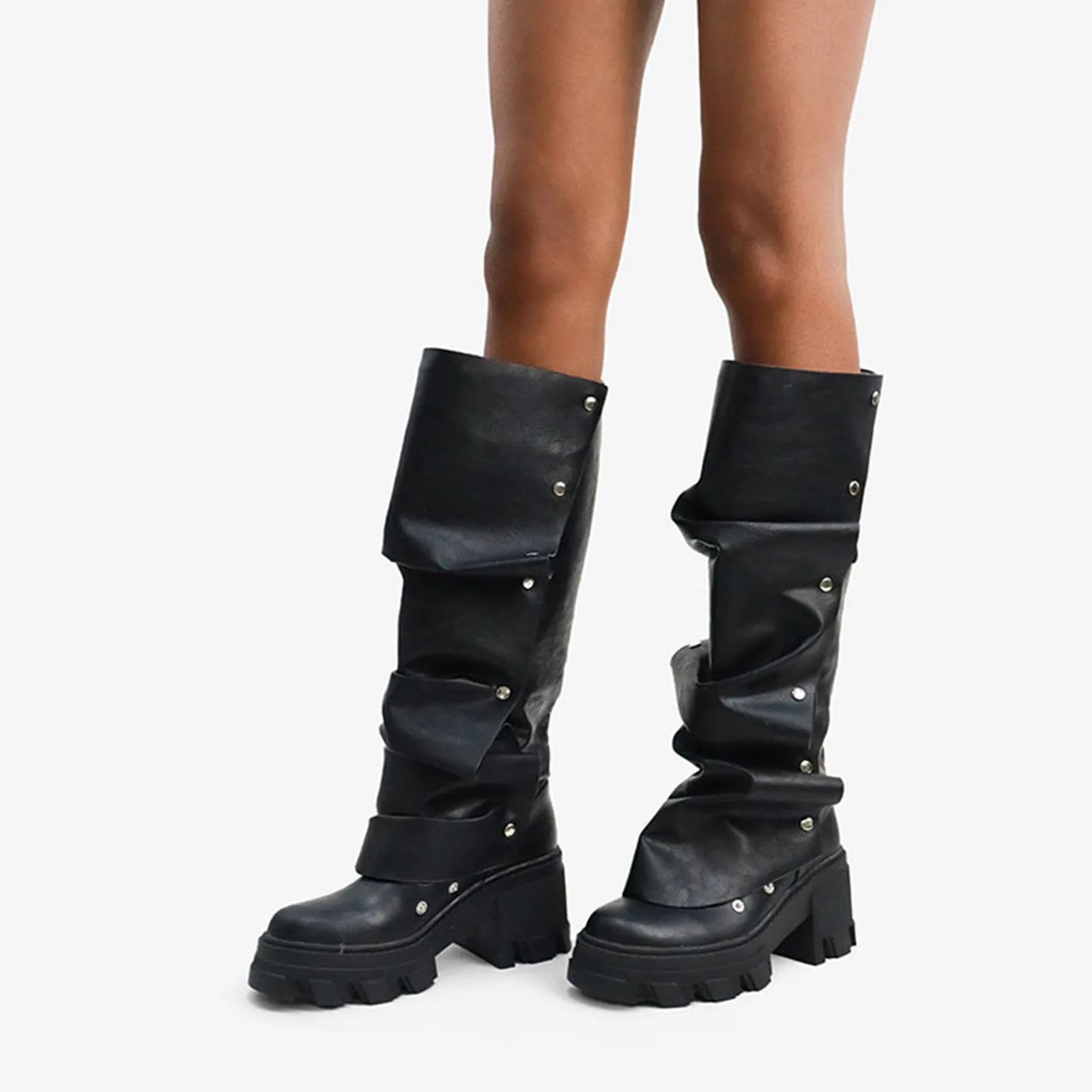 Make a bold statement with these striking chunky metal button knee-high boots. Engineered for those who refuse to blend in, these boots feature oversized metal button detailing that commands attention with every step. Pair with leather, denim, or dresses for an undeniably fierce look that turns heads.