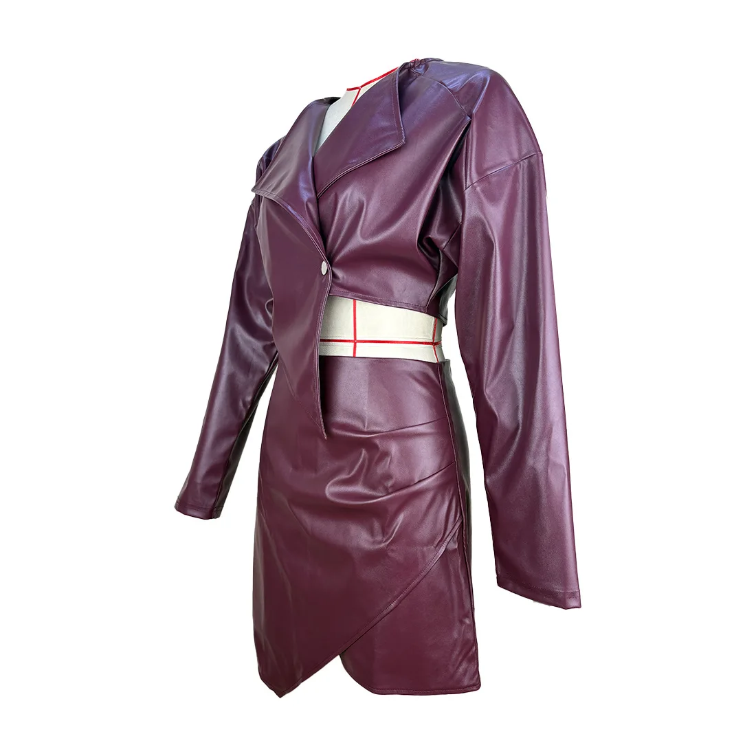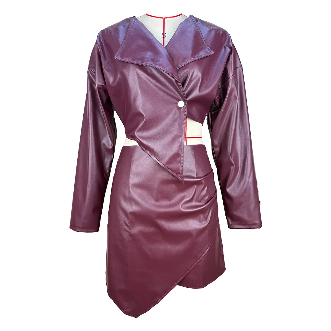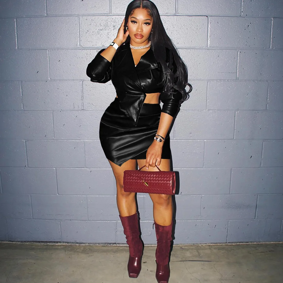 Own your power in this fearless leather bodycon skirt set. The sculpted V collar frames your silhouette with precision while the form-fitting design celebrates your curves unapologetically.
